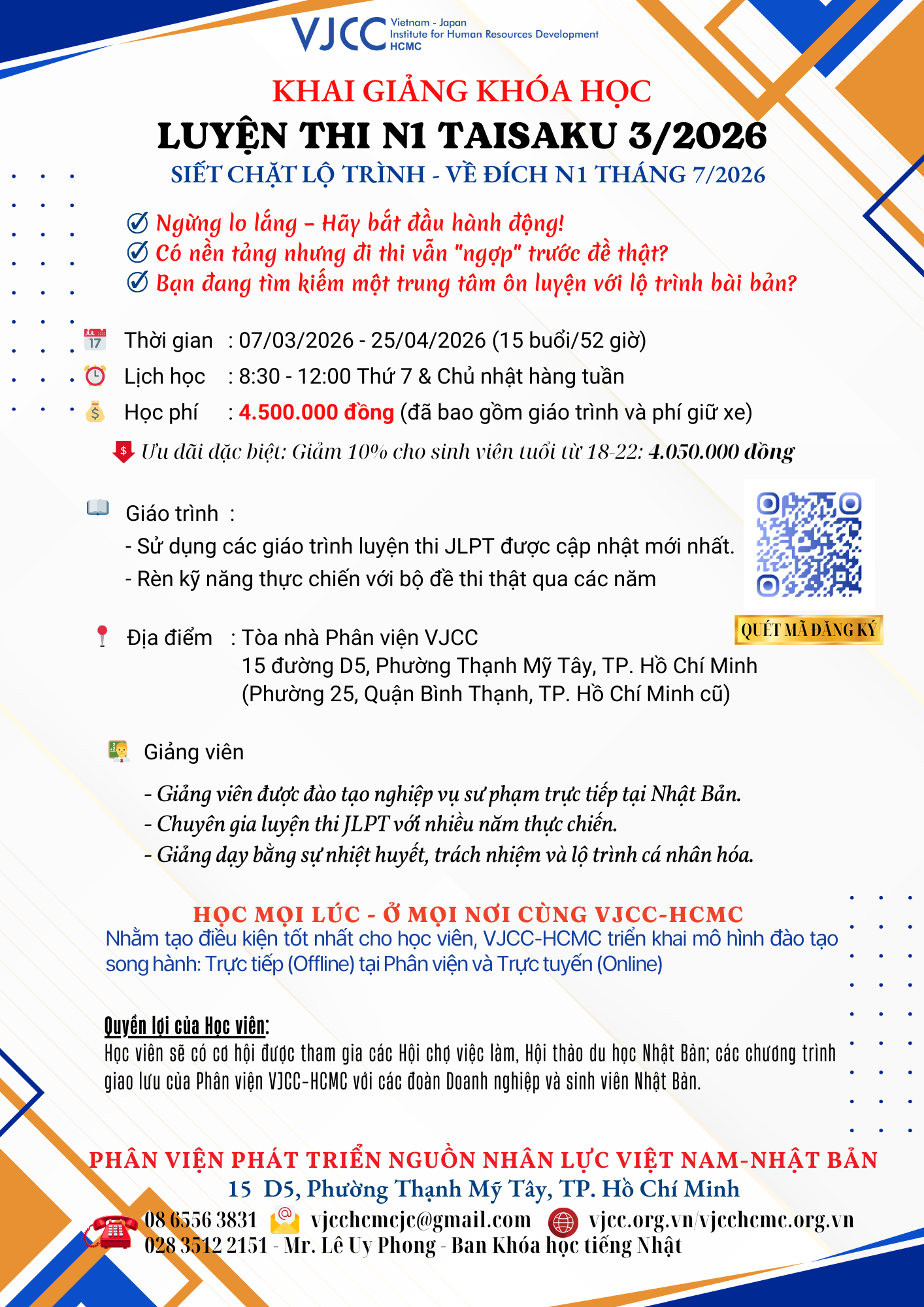 Xin vui lòng liên hệ đăng ký trực tiếp với tiếp tân VJCC hoặc gởi Phiếu đăng ký qua Email đến cho chúng tôi trước: 17 giờ ngày 04 tháng 03 năm 2026 (thứ 4)