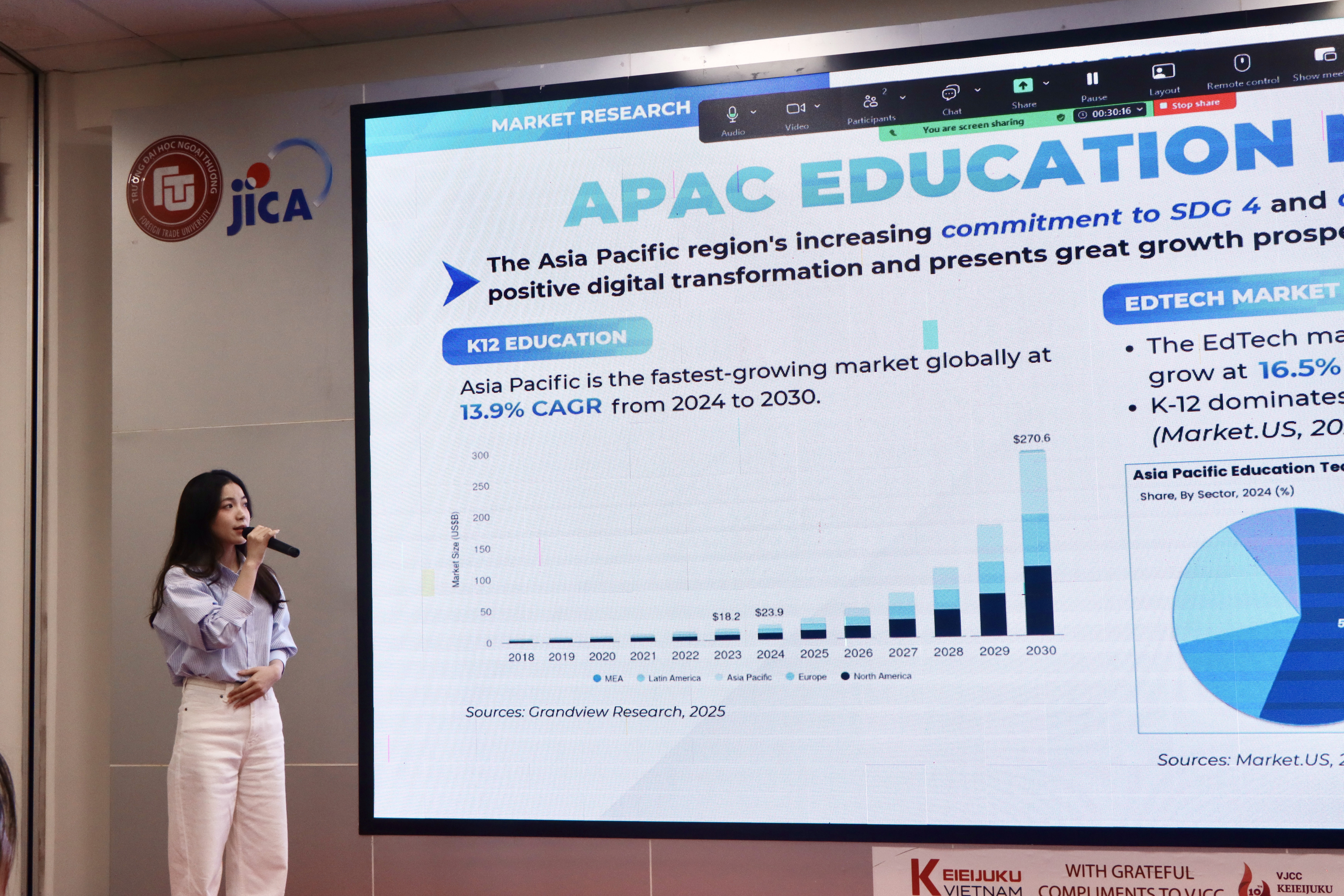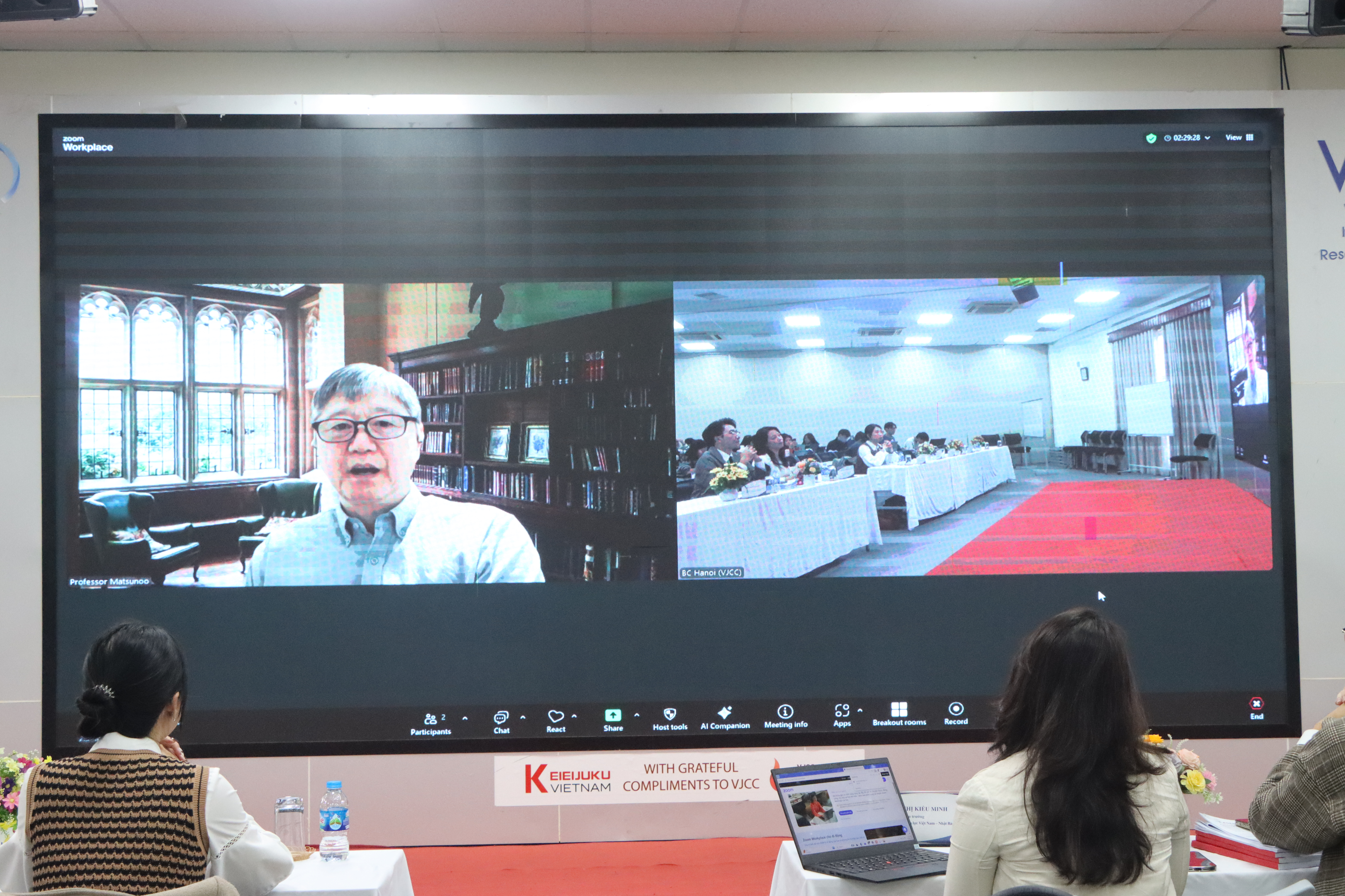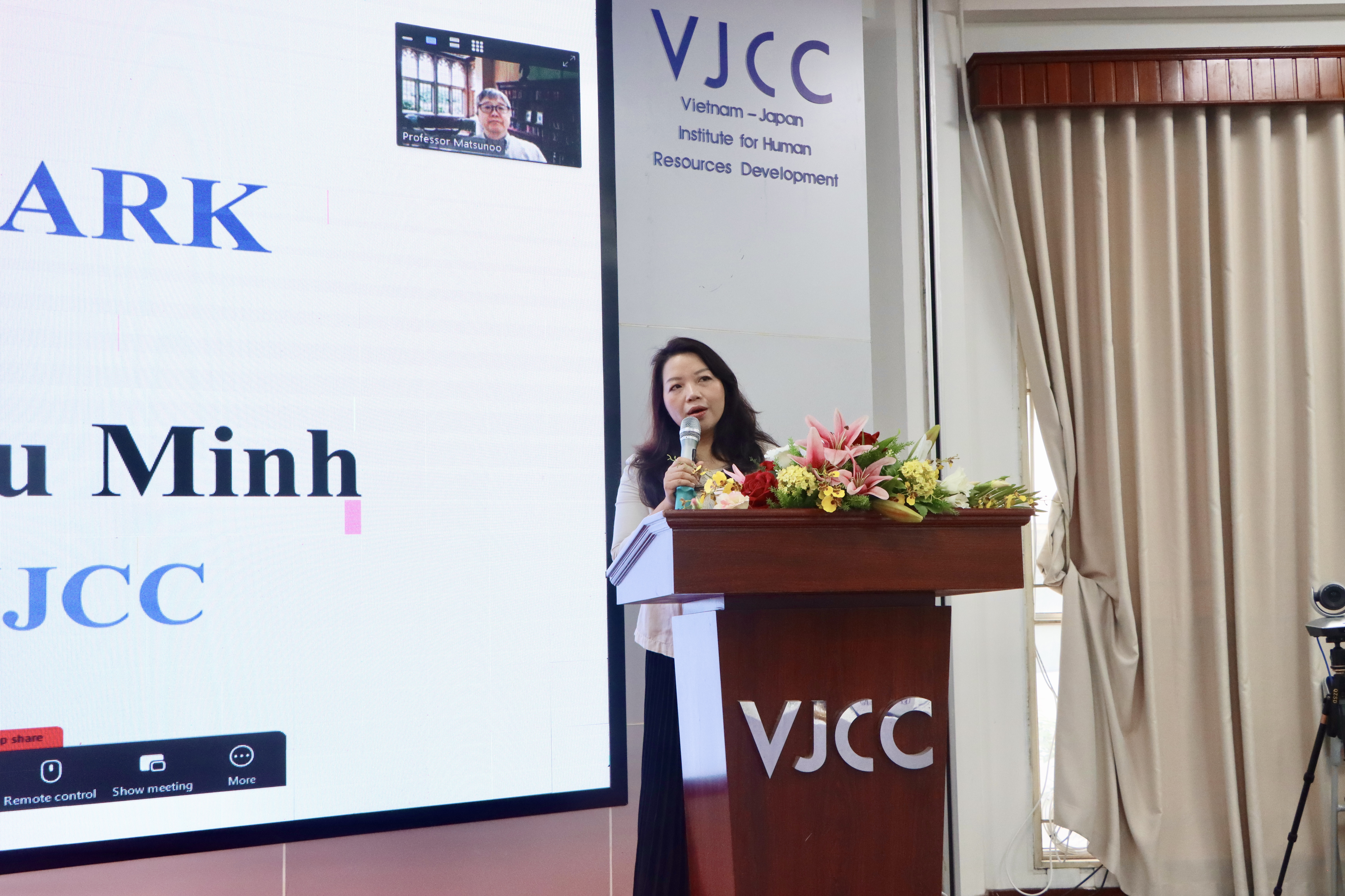 Phát biểu khai mạc, ThS. Trần Thị Kiều Minh nhấn mạnh giá trị cốt lõi của VBIZ III không chỉ dừng lại ở việc truyền đạt kiến thức quản lý kinh doanh, mà còn là hành trình rèn luyện bản lĩnh toàn cầu cho sinh viên. Cô cũng gửi lời cảm ơn chân thành đến GS. Vas Taras (Đại học North Carolina) – người sáng lập nền tảng X-Culture, và GS. Matsunoo Moeru (Đại học Waseda và Đại học Kanto Gakuin) – những người đã kiến tạo và đồng hành cùng VJCC trong việc triển khai học phần VBIZ III, giúp sinh viên Việt Nam có cơ hội học tập trong môi trường quốc tế ngay tại chính quê hương của mình.