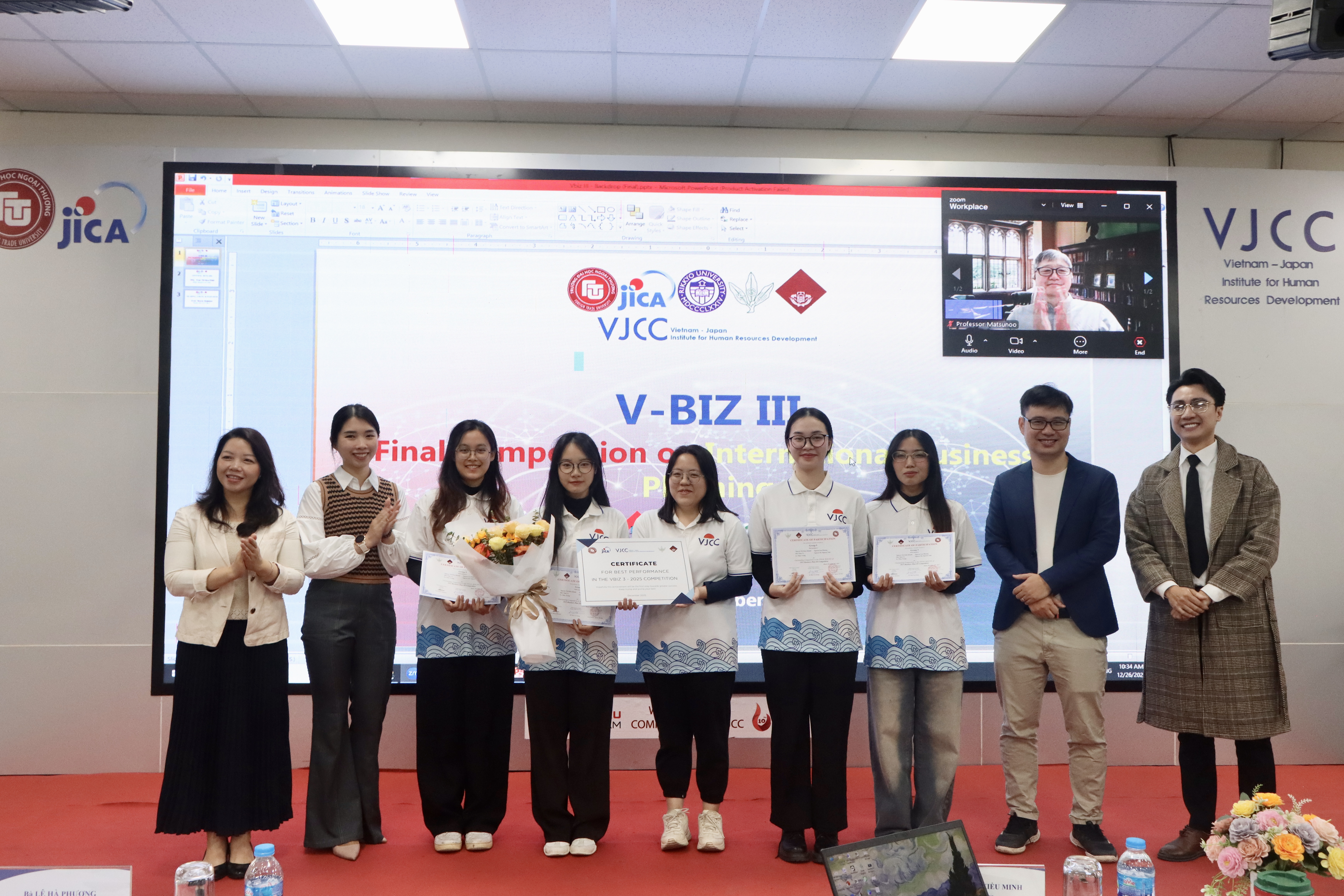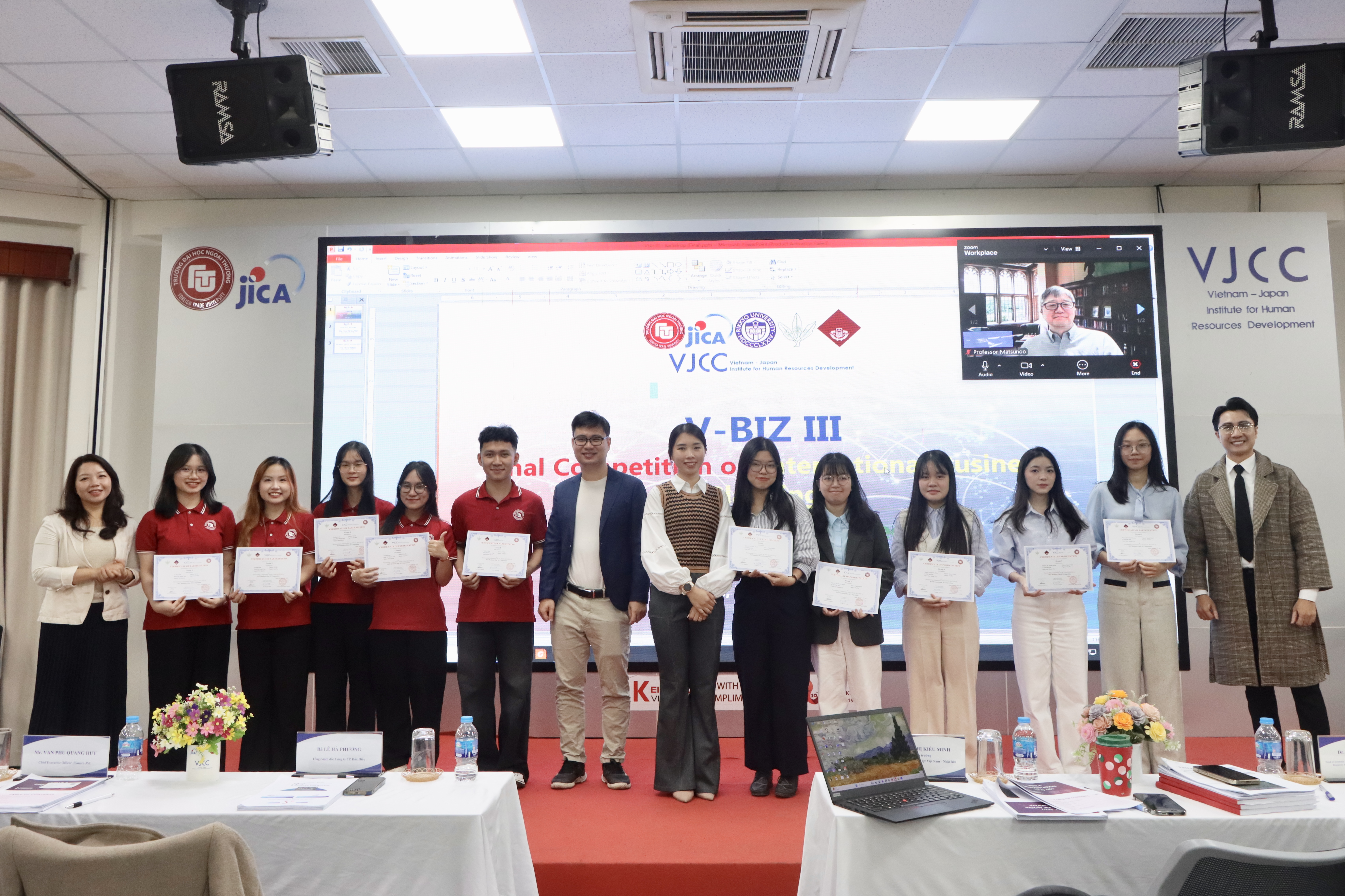 Vòng chung kết vinh dự có sự tham dự của đại diện trường đại học đối tác – GS. Matsunoo Moeru đến từ Đại học Kanto Gakuin và Đại học Waseda, cùng đại diện từ cộng đồng doanh nghiệp – bà Lê Hà Phương (Tổng Giám đốc Công ty Cổ phần Đức Hiếu) và ông Văn Phú Quang Huy (Giám đốc Công ty Cổ phần Pionero). Về phía Viện VJCC, cuộc thi có sự tham gia của ThS. Trần Thị Kiều Minh – Phó Viện trưởng Viện VJCC, TS. Hoàng Anh Duy – Trưởng Bộ môn Nghiệp vụ Viện VJCC, các giảng viên cùng toàn thể sinh viên các khóa của Chương trình Cử nhân Kinh doanh quốc tế theo mô hình tiên tiến Nhật Bản (JIB) và Kinh doanh số (DB) của Viện VJCC.