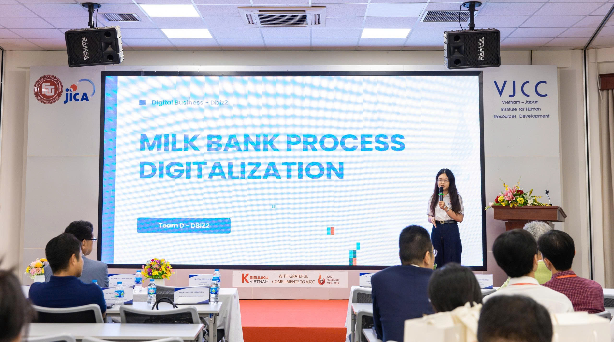 Milkbank là nhóm sinh viên tiêu biểu trong Cuộc thi Dự án kinh doanh số Dbiz 2 với dự án tối ưu hóa quy trình thu thập sữa mẹ của Ngân hàng sữa Việt Nam thông qua chuyển đổi số. Không chỉ gây ấn tượng với ý tưởng của mình, các em còn cho người tham dự thấy những tương tác thực tế của quy trình cho sữa sau chuyển đổi số thông qua phần mềm hỗ trợ.