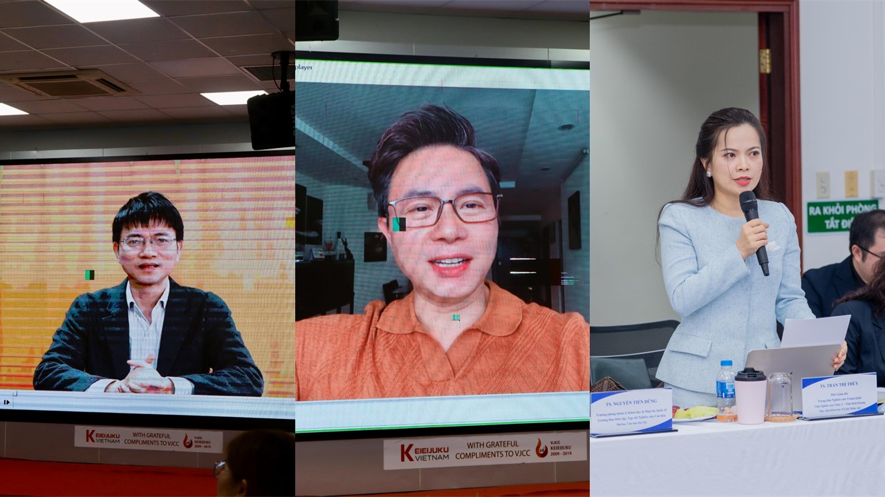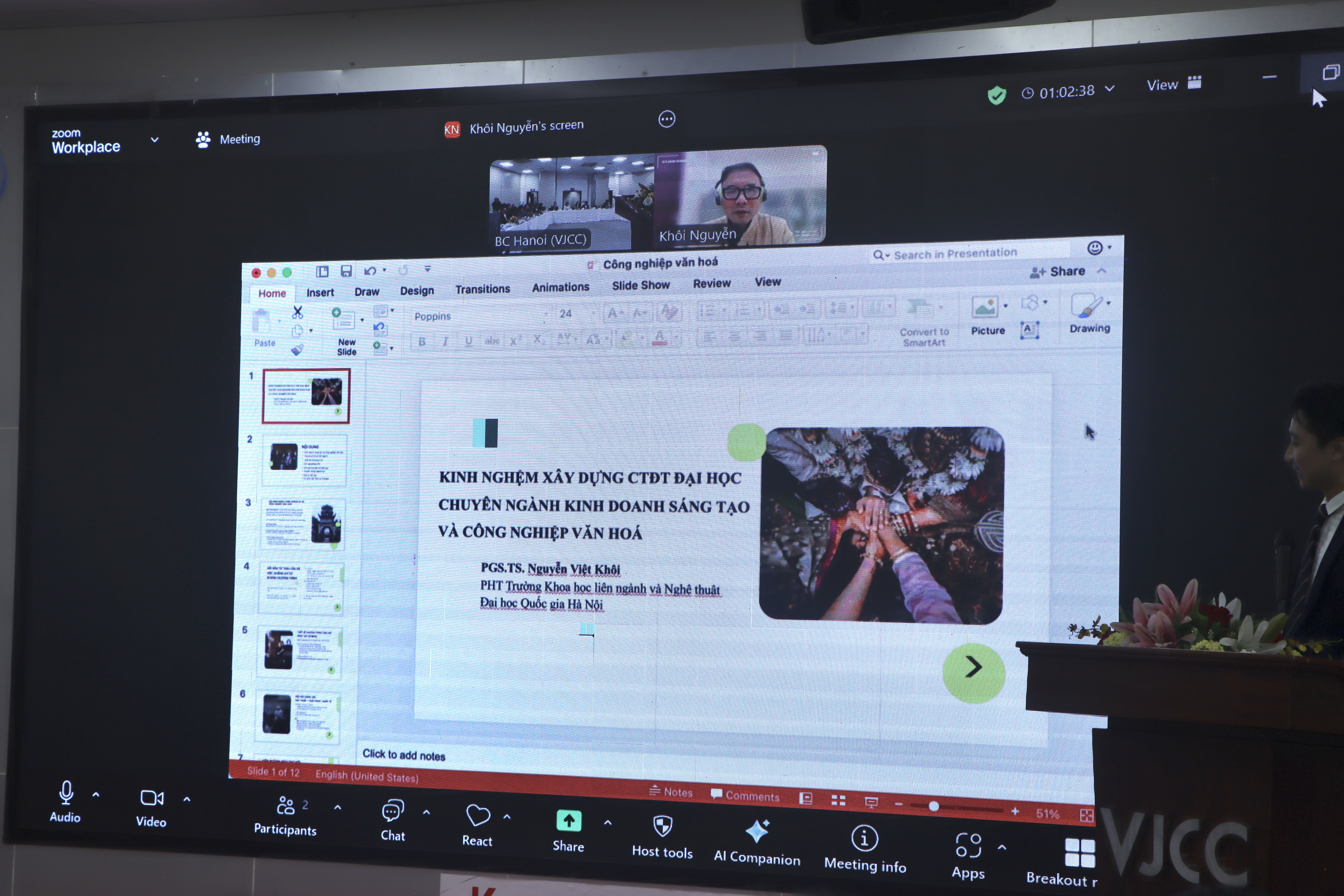 Mở đầu hội thảo, PGS, TS Nguyễn Thị Hiền trình bày về cách tiếp cận xây dựng CTĐT Kinh doanh sáng tạo và Công nghiệp văn hóa theo định hướng thiết kế chương trình hiện đại, gắn kết chặt chẽ giữa mục tiêu đào tạo, chuẩn đầu ra và nhu cầu thực tiễn của thị trường lao động. Đặc biệt, PGS, TS Nguyễn Thị Hiền đã nhấn mạnh về khung CTĐT với cấu trúc tích hợp giữa ba trụ cột chính gồm: (1) kiến thức nền tảng kinh tế - kinh doanh - quản trị; (2) kiến thức về văn hóa, đổi mới sáng tạo, kinh doanh sáng tạo và hệ sinh thái công nghiệp văn hóa – sáng tạo; (3) thực hành kinh doanh sáng tạo, chuyển đổi số và khởi nghiệp. Các trụ cột này được kết nối xuyên suốt thông qua mô hình học tập theo dự án (PBL) với chuỗi học phần cap-CCI, giúp người học từng bước hình thành, phát triển và triển khai các dự án kinh doanh văn hóa - sáng tạo từ cấp độ khởi nghiệp đến hệ sinh thái ở cấp độ doanh nghiệp và địa phương. Chương trình được tổ chức triển khai theo mô hình Phát triển nghề nghiệp (Career Development Integrated Training Model) của Nhà trường, kết hợp cơ chế hợp tác đa bên giữa Trường ĐH Ngoại thương, Viện VJCC và các đối tác trong nước và quốc tế, bao gồm các cơ sở đào tạo/viện nghiên cứu và các doanh nghiệp, qua đó hoàn thiện hệ sinh thái đào tạo toàn diện và gắn liền với thực tiễn.