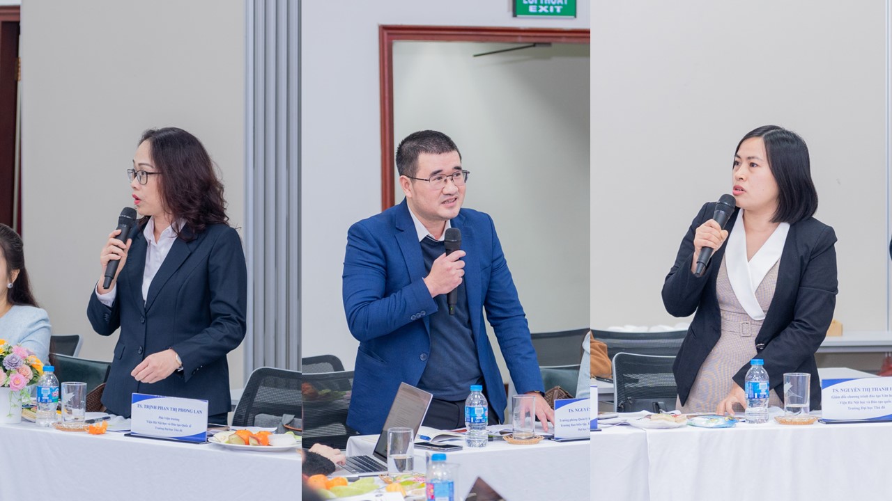 Từ trái qua phải: TS Trịnh Phan Thị Phong Lan - Phó Viện trưởng Viện Hà Nội học và Đào tạo Quốc tế, Trường Đại học Thủ đô Hà Nội; TS Nguyễn Tiến Dũng - Trưởng phòng Quản lý khoa học và Hợp tác quốc tế, Trường Đại học Văn hóa Hà Nội; TS Nguyễn Thị Thanh Hòa - Giám đốc chương trình đào tạo Văn hoá học, Viện Hà Nội học và Đào tạo quốc tế, Trường ĐH Thủ đô