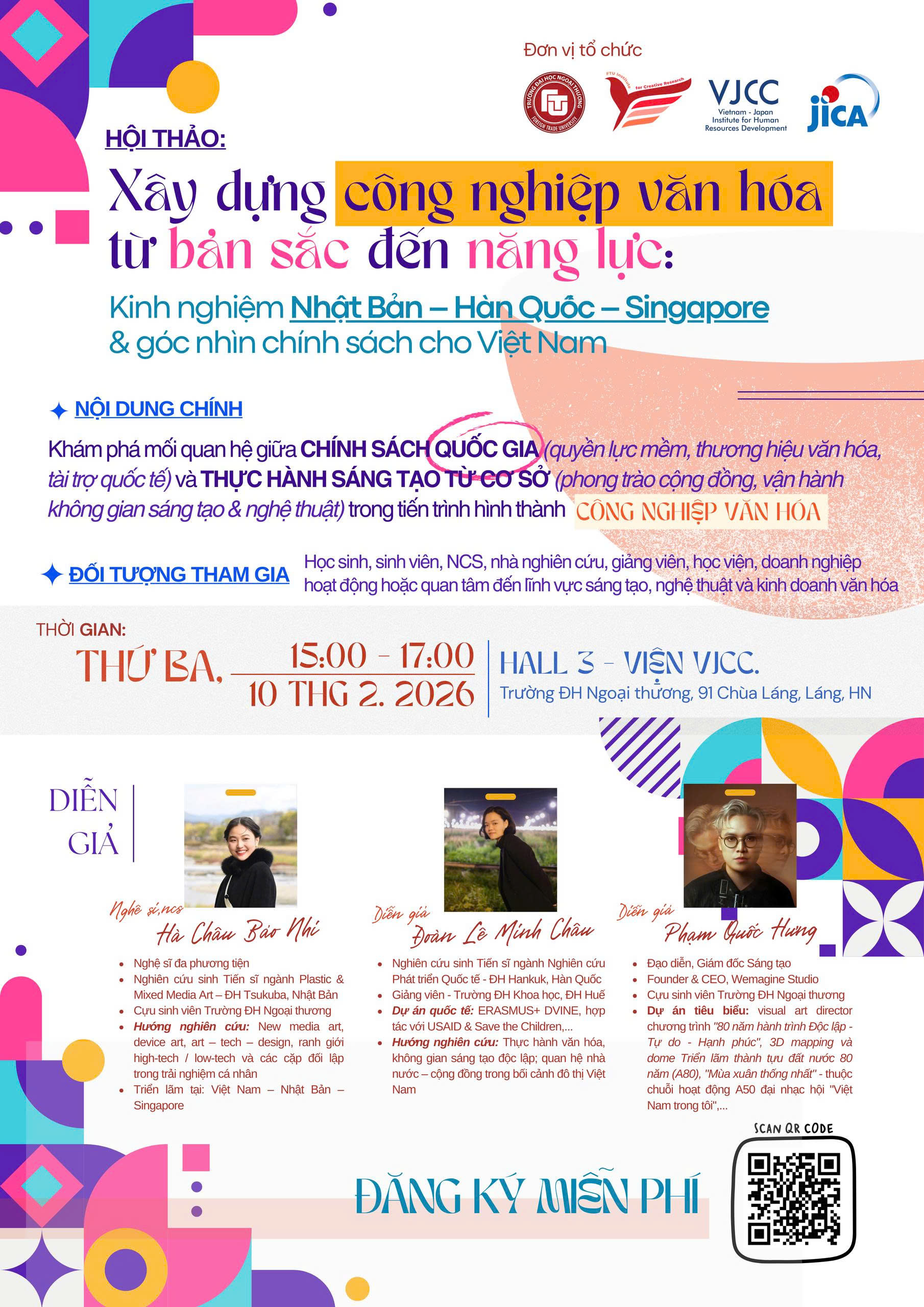 Địa điểm: Hội trường tầng 3 - Viện VJCC – Trường Đại học Ngoại thương, 91 Chùa Láng, Hà Nội