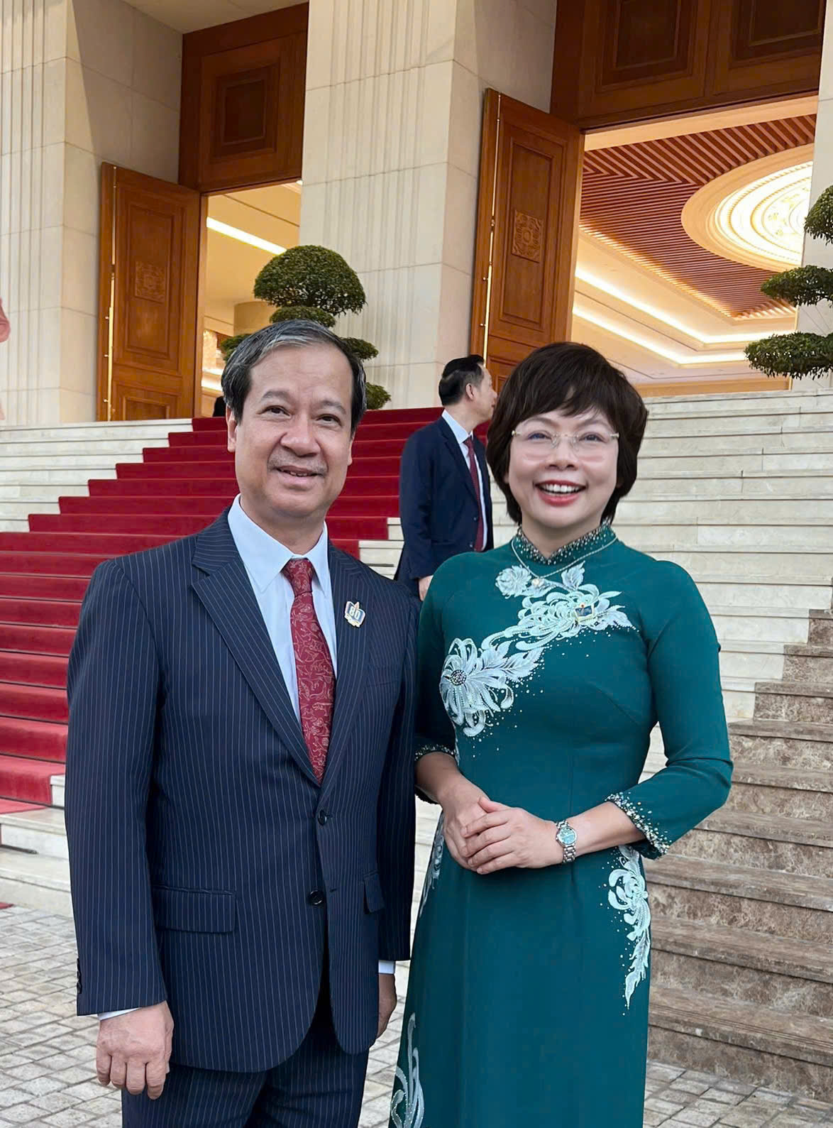 PGS. TS. Nguyễn Thị Hiền chụp ảnh cùng PGS.TS. Nguyễn Kim Sơn - Bộ trưởng Bộ Giáo dục và Đào tạo tại buổi gặp mặt ngày 15/11