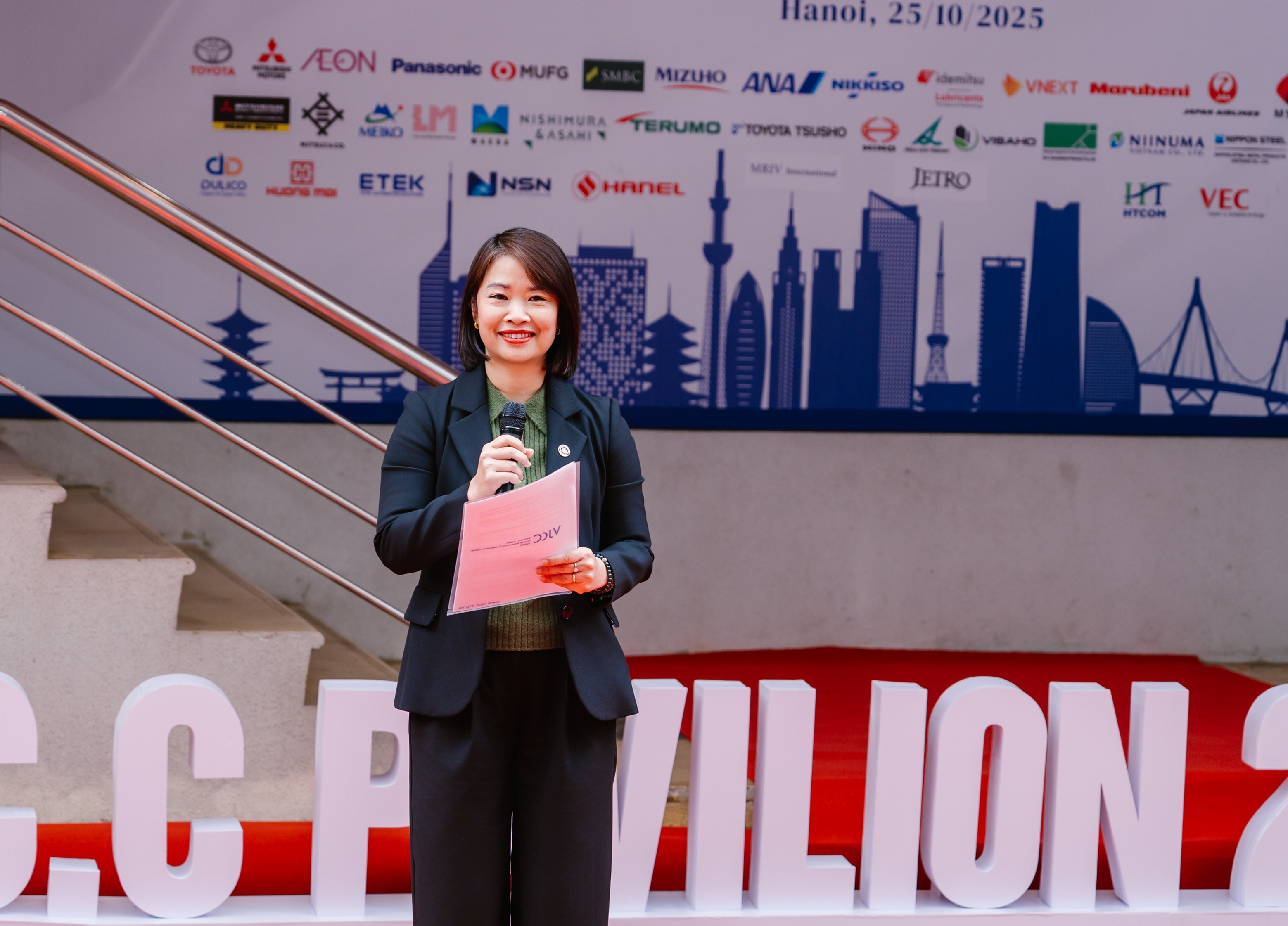 Trong bài phát biểu của mình, PGS, TS Vũ Thị Hiền – Phó Hiệu trưởng Trường ĐH Ngoại thương nhấn mạnh ý nghĩa của sự kiện diễn ra trong không khí hân hoan hướng tới kỷ niệm 65 năm Trường Đại học Ngoại thương. Đây là ngày hội kết nối việc làm quy mô do Viện VJCC, Trường Đại học Ngoại thương, JCCI và JICA phối hợp tổ chức, thể hiện mối quan hệ Đối tác Chiến lược Toàn diện Việt Nam – Nhật Bản. Cô khẳng định V.J.C.C Pavilion 2025 là hoạt động tiêu biểu của hệ sinh thái Doanh nghiệp – Nhà trường – Người học, thúc đẩy đổi mới sáng tạo và hội nhập quốc tế. Với sứ mệnh đào tạo công dân toàn cầu, Trường Đại học Ngoại thương mong muốn sự kiện không chỉ là nơi tuyển dụng mà còn là diễn đàn chia sẻ tri thức và truyền cảm hứng nghề nghiệp cho sinh viên. Cô cũng mong muốn thông qua sự kiện lần này, sinh viên sẽ chủ động giao tiếp, học hỏi và nắm bắt cơ hội nghề nghiệp trong kỷ nguyên hiện đại hoá của đất nước. Khép lại bài phát biểu của mình, PGS, TS Vũ Thị Hiền cũng không quên gửi lời tri ân tới các đối tác Nhật Bản và Việt Nam, đồng thời cam kết tiếp tục mở rộng các hoạt động hợp tác quốc tế, xây dựng môi trường học tập sáng tạo và bền vững cho sinh viên.