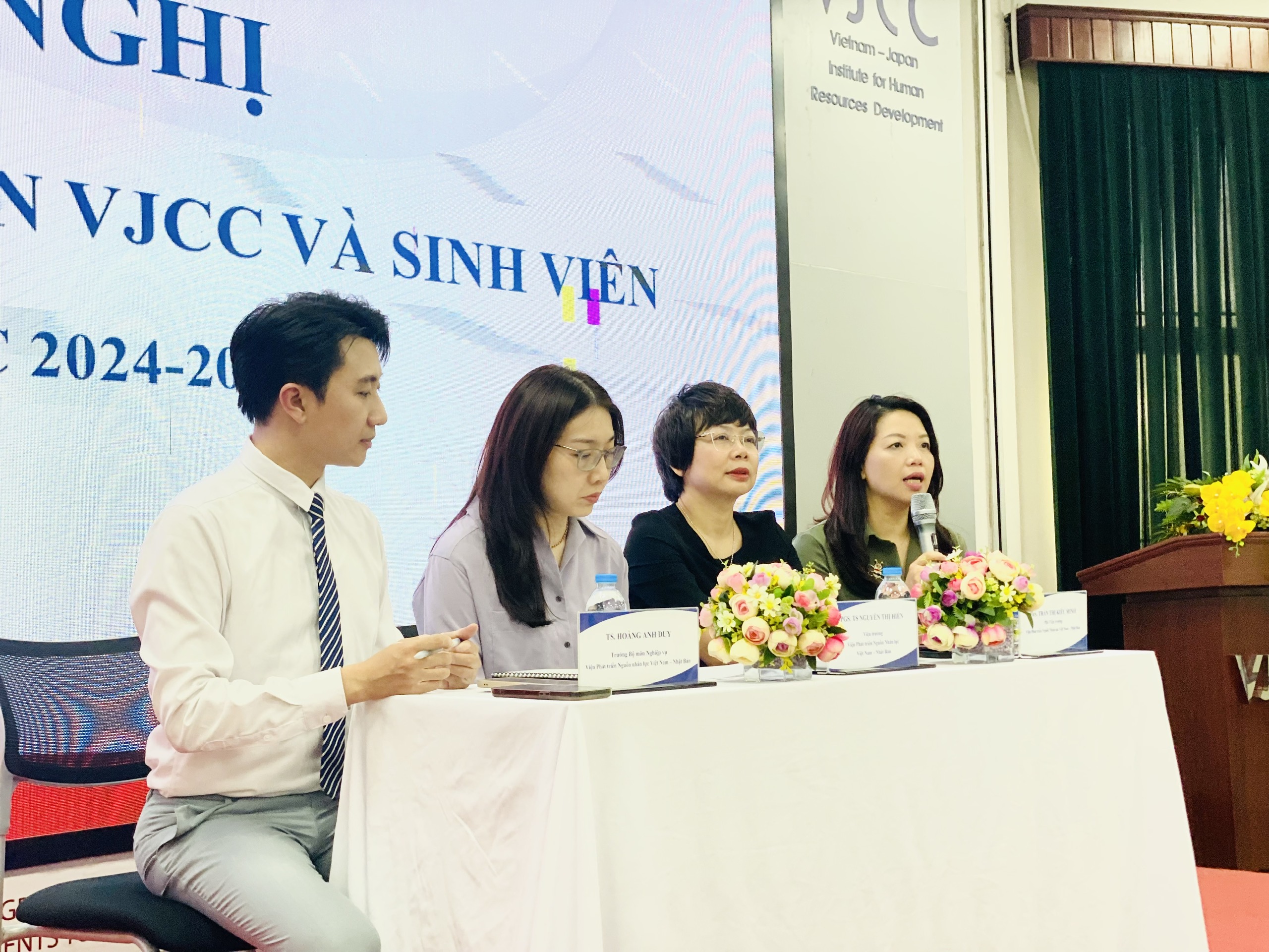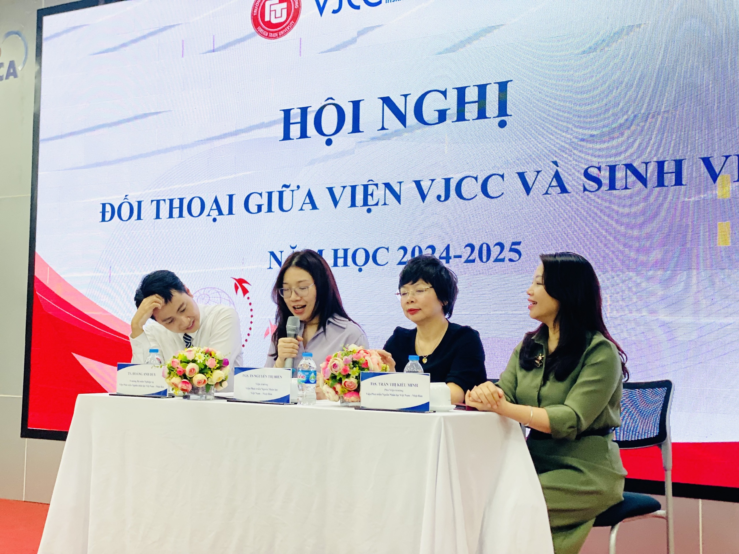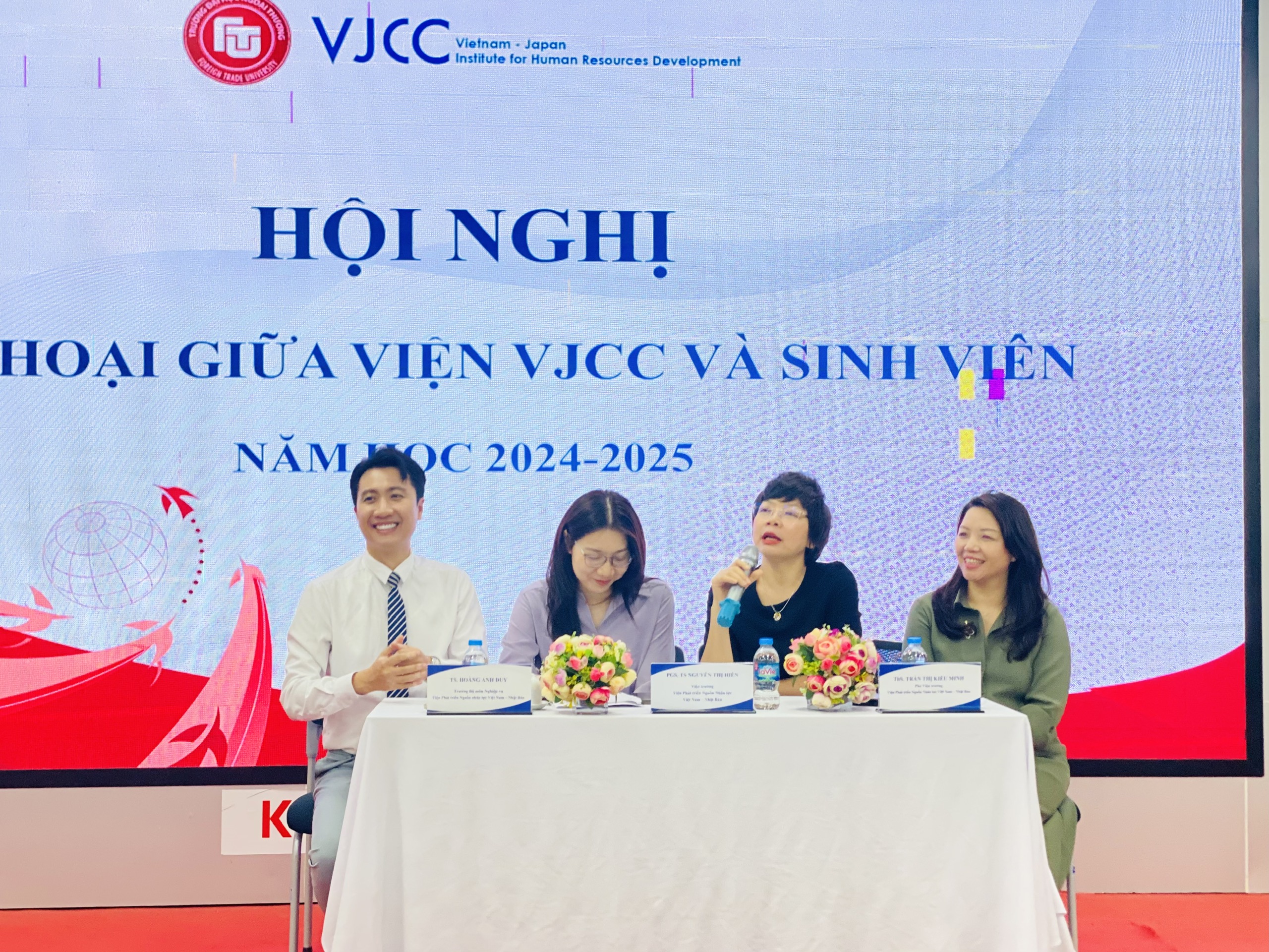 Chiều ngày 16/04/2025, Viện Phát triển nguồn nhân lực Việt Nam - Nhật Bản (VJCC) tổ chức Hội nghị đối thoại giữa Viện với sinh viên năm học 2024 - 2025. Hội nghị vinh dự chào đón sự tham gia của PGS.TS Nguyễn Thị Hiền - Viện trưởng Viện VJCC - Chủ tọa Hội nghị, ThS Trần Thị Kiều Minh – Phó Viện trưởng Viện VJCC - Phó Chủ tọa, TS Hoàng Anh Duy – Trưởng Bộ môn Nghiệp vụ Viện VJCC - Uỷ viên cùng các cán bộ Ban đào tạo chính quy, giáo viên chủ nhiệm và đại diện các tập thể lớp đang theo học tại Viện.